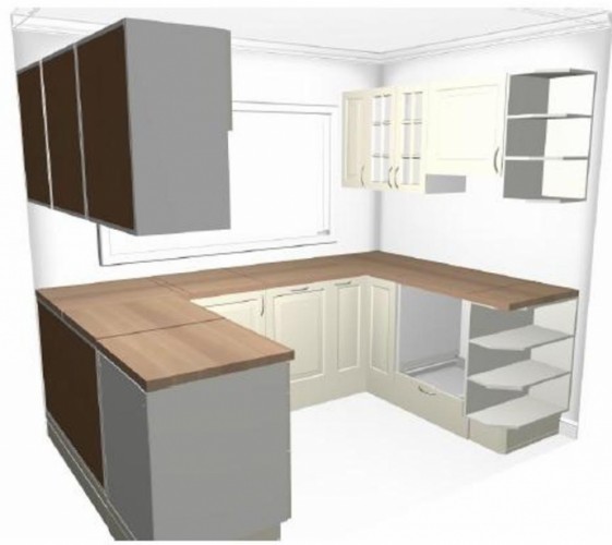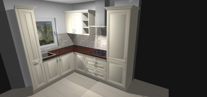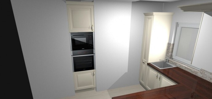 С позволения, моим опытным глазом)))посоветую отодвинуть от боковых шкафов мойку и варочную поверхность мин. на 30 см( первое из практичности, второе по соблюдению пожарной безопасности). Подумайте как расположить мойку и кран, чтобы окно открывалось. Практичнее, когда функция варки собрана в одном месте. Если позволяют размеры, поменяйте местами модули — встроенный холодильник/морозильник с духовкой/ комбинированым духовым шкафом. Еще глядя на фотографию и на проект мне кажется, что не стыковка в размерах стены под окном. Я могу ошибаться, но на фото вижу приблизительные размеры от левого края- 60см, окно 100 см, 30 у края, в визуализации или искаженный угол или даны неправильные размеры стены под окном(высокий шкаф 30-40 см и еще место у окна ? ) Проверьте, обязательно.