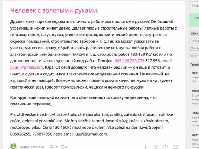 Добрый день. Видела пост про человека с золотыми руками, который умеет почти всё! И жнец и на дуде игрец, и всё за 100-150 крон за час. Не могу найти, к сожалению. Пожалуйста, помогите найти (или пост или человека)!! Спасибо))