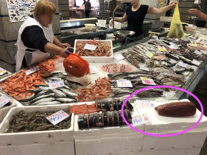 Вот такого цвета свежий тунец в Хорватии. Сравнивайте.да вот этот такой же в принципе, только я привыкла к более красному) свежевыловленный мне попадался и повеселее) да и в хорватии встречала более красного...попробую как-нибудь еще раз)