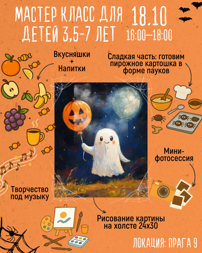 Рисуем весёлое привидение на холсте (формат 24×30 см). Настоящая работа акрилом и кистями — ребёнок унесёт домой собственную картину