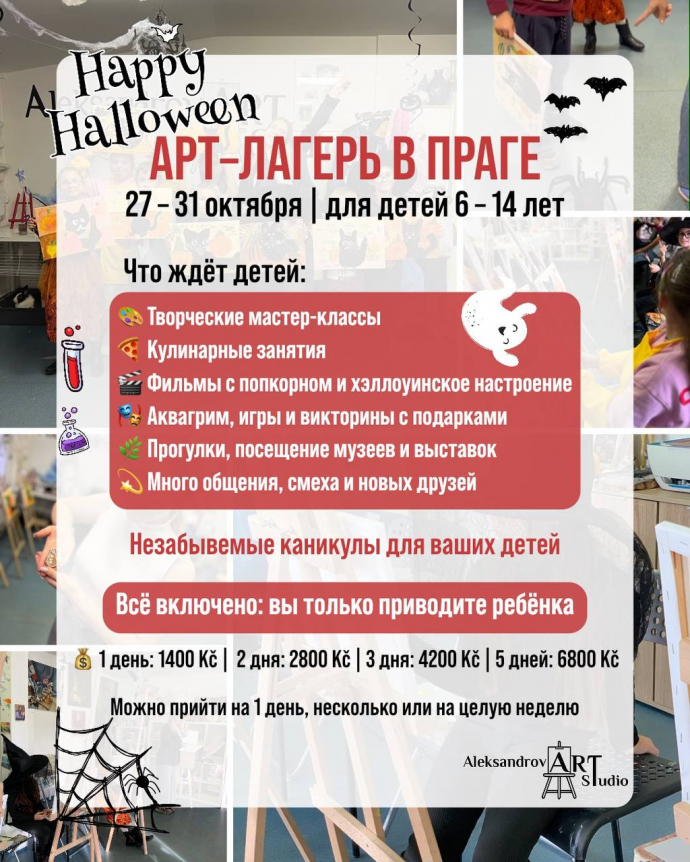 - Полная смена (5 дней): 6800 Kč (всё включено: обеды, материалы, билеты, угощения)