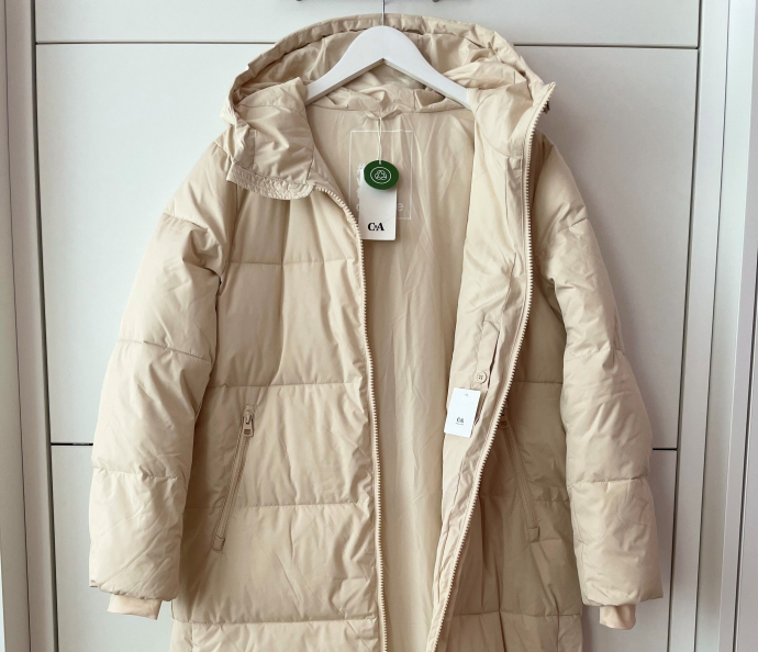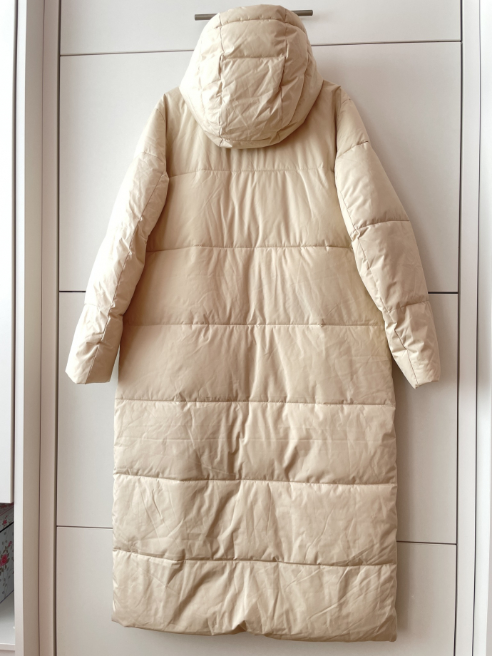 Пуховик с капюшоном, кремового цвета, два кармана, 1 внутренний, длина 123 см. Кому интересно, пишите в личку.