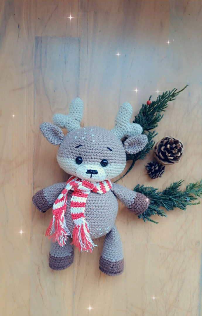 Здравствуйте. Предлагаю к продаже вязаного крючком оленя из пряжи Yarnart Jeans. Рост около 25 см, глазки на безопасном креплении, цена 389 Kč