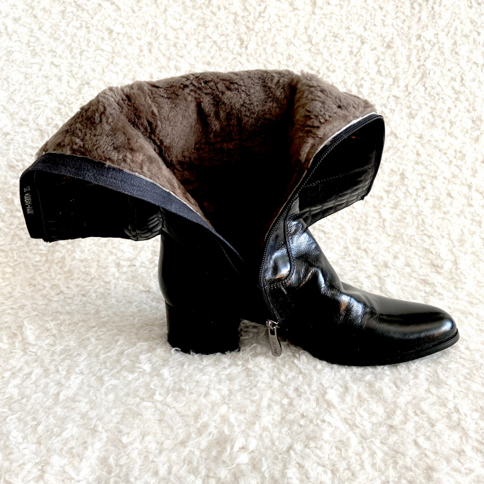 Натуральная лакированная кожа, натуральный мех. Размер 35, но соответствуют размеру 36. 1300 крон. Прага-9.