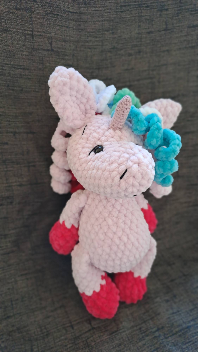 Милый единорог связан крючком. Связан вручную из мягкой пряжи Dolpfin Baby. Размер: 21 см. Пряжа гипоаллергенна, имеет сертификат TZÚ о безопасности для здоровья и подходит для использования в изделиях для детей до 3 лет. Цена 385 Kč.