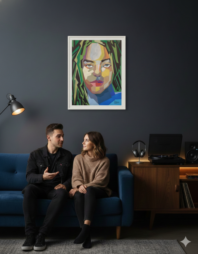 Этот выразительный портрет, созданный в стиле синтетического кубизма, является художественным воплощением глубокого впечатления от песни «I Love You» Билли Айлиш. Художник Петрова передает сложную эмоциональную палитру певицы через смелую фрагментацию форм и яркие акриловые блоки. Геометрические грани лица и контрастный зеленый фон отражают многогранность личности Айлиш и атмосферу ее музыки – одновременно хрупкую и мощную. Это не просто портрет, а визуальная симфония, приглашающая зрителя ощутить резонанс между музыкой и живописью. Всем поклонникам Билли посвящается!