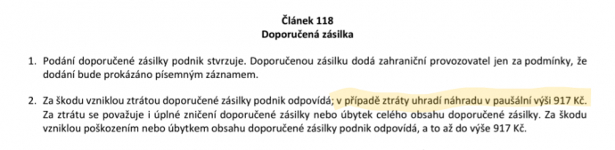Za škodu vzniklou ztrátou doporučené zásilky podnik odpovídá; v případě ztráty uhradí náhradu v paušální výši 917 Kč.