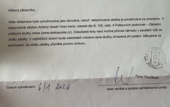 Я бы вам рекомендовала написать жалобу на email инфолинки что вам по таким то рекламациям не выплатили náhradu škody согласно параграфе 118 поштовних подминек. Приложите копию рекламации и вот этой поуказки. Это ваша почта что-то мутит. А вы теряете 900 крон как минимум. Пусть дадут объяснение.