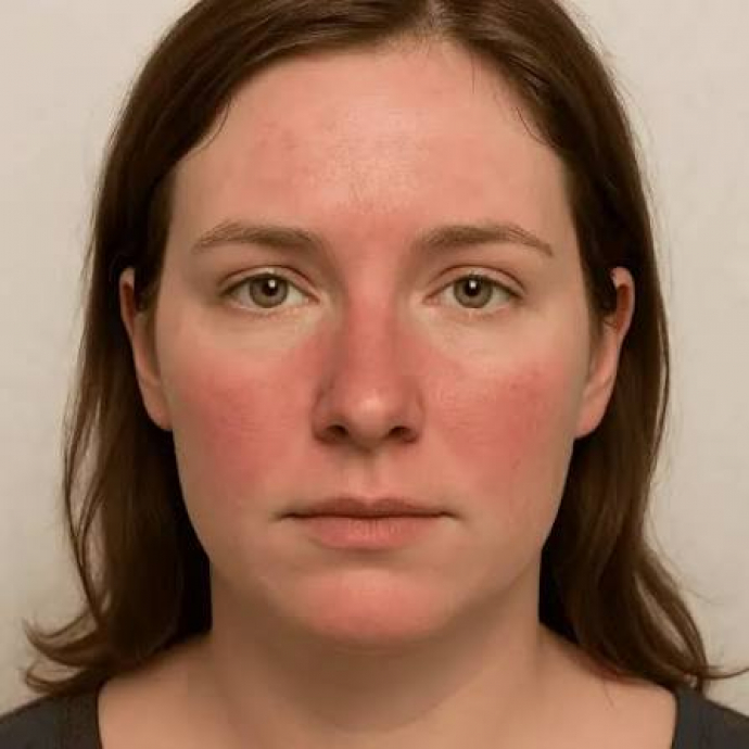Меня эта хрень тоже не обошла и я долго не знала, что у меня вообще розацеа, ну так румяная и румяная, и ладно. Никаких воспалений и прыщей нет. Общий вид, как будто я загорела в солнечных очках или как будто побывала на сильном ветре, или с мороза в дом зашла. Выглядит вот так (фото из интернета).