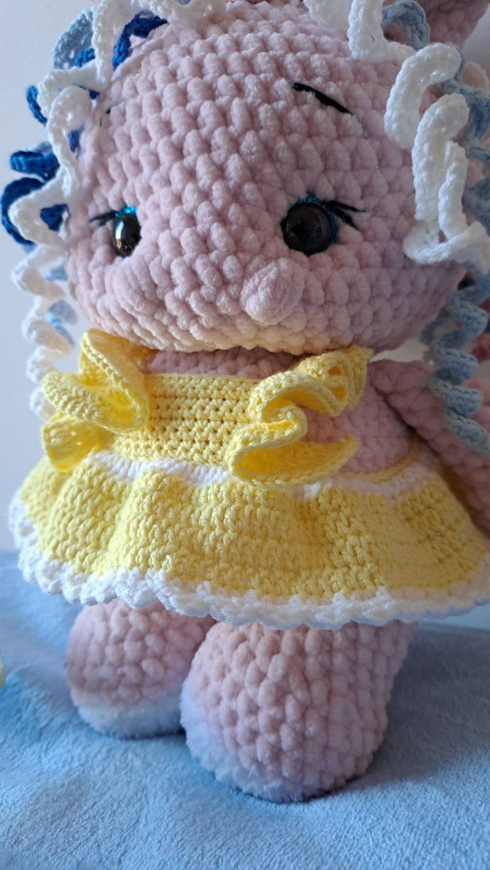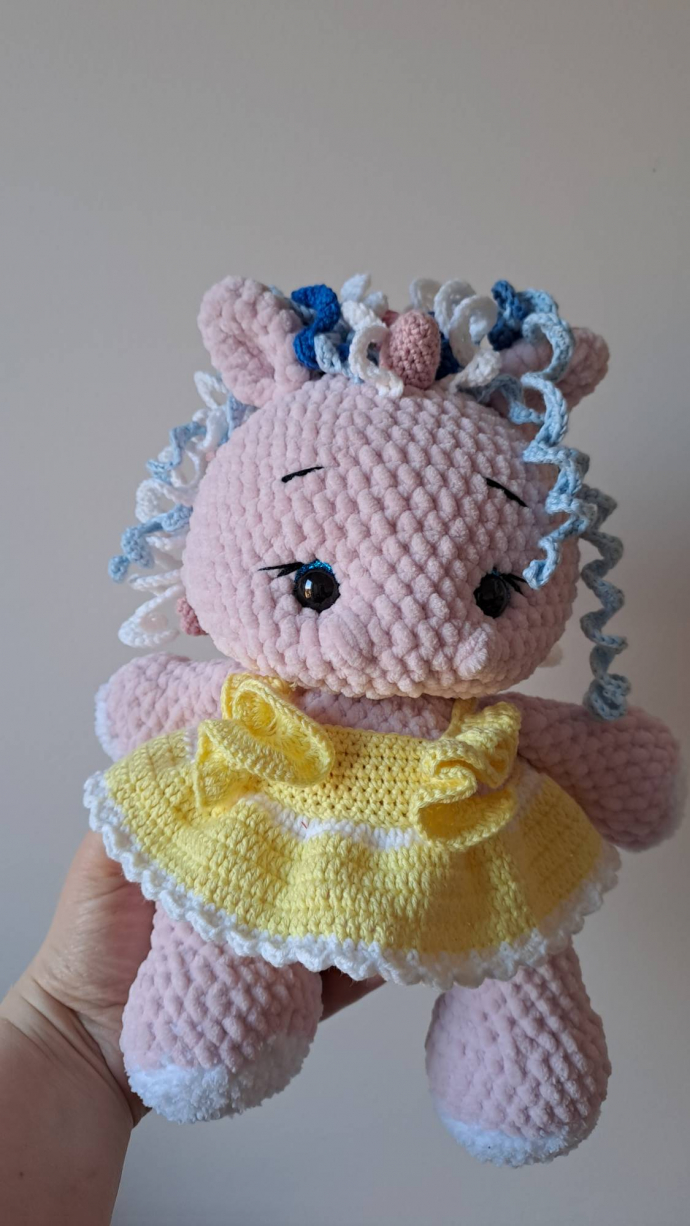 Здравствуйте. Милый вязаный крючком единорог в платье. Ручная работа из мягкой пряжи Dolpfin Baby. Размер 26 см. Цена 450 Kč. Плюшевая игрушка имеет безопасные глазки. Изделие нельзя гладить или отбеливать.