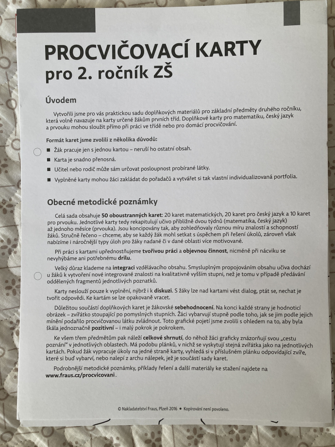 Добрый день, отдам бесплатно учебное пособие для 2 класса начальной школы. Содержит 20 карт по математике, 20 по чешскому языку и 10 карт — prvouka. Заполнена 1 карта по математике и одна по ЧЯ. Забирать на Праге 8 — район Буловки.