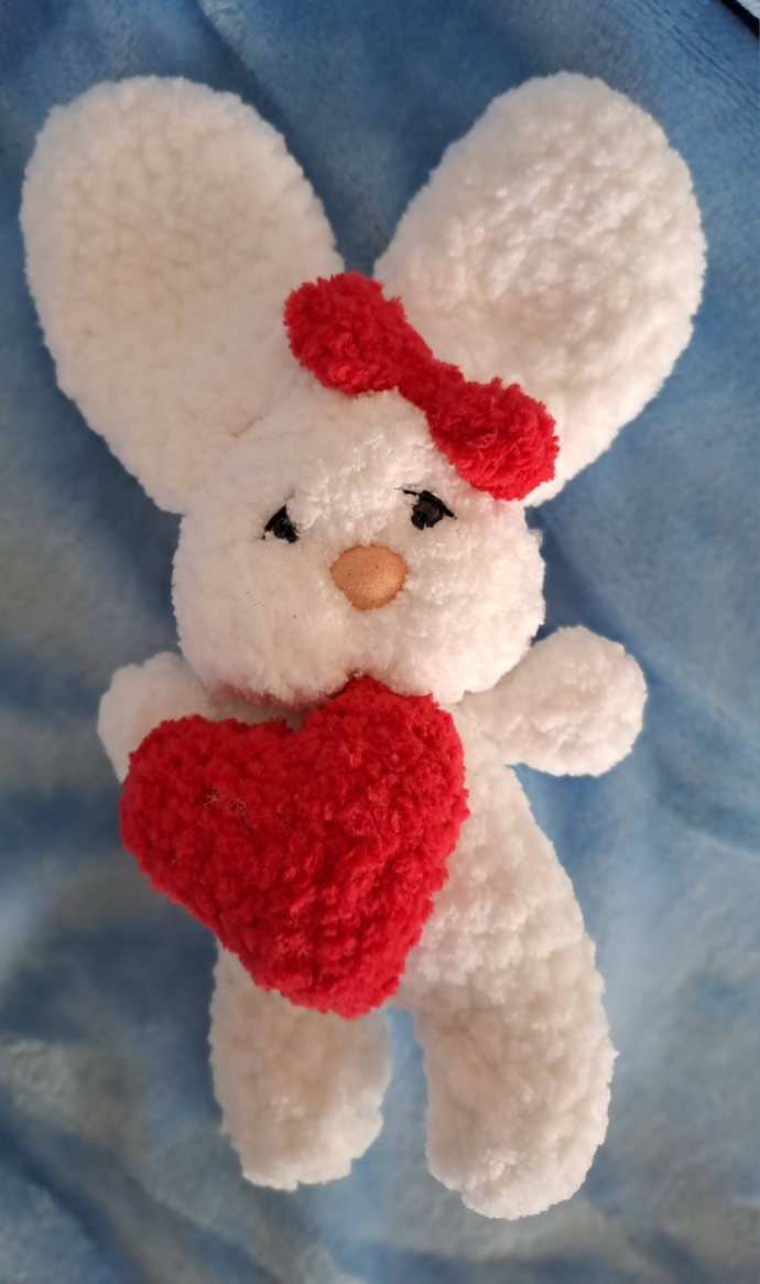 Продаю мягкую игрушку из пряжи Alize Softy Plus. заяц с сердцем 19 см — 250 kč. Глаза на безопасном креплении.