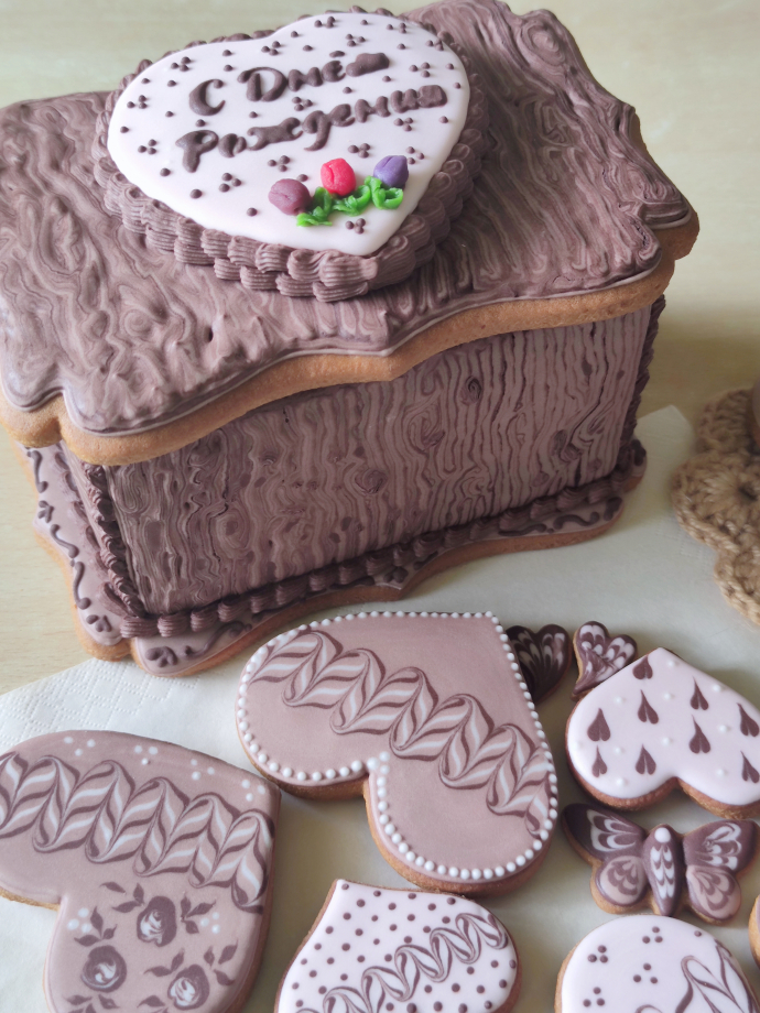 Я созрела на большой проект — пряничную шкатулку. Причем захотелось мне не сделать под дерево. Вот что из этого получилось.