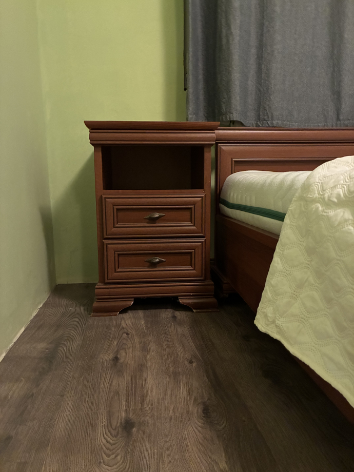 Комплект мебели, кровать с двумя ортопедическими матрасами, регулируемые положение спины рошти, тумбы и столик с зеркалом от этого же комплекта. Матрасы вычищены пароочистителем, все целое. Кровать будет в разобранном виде. 15 тыс крон, самовывоз