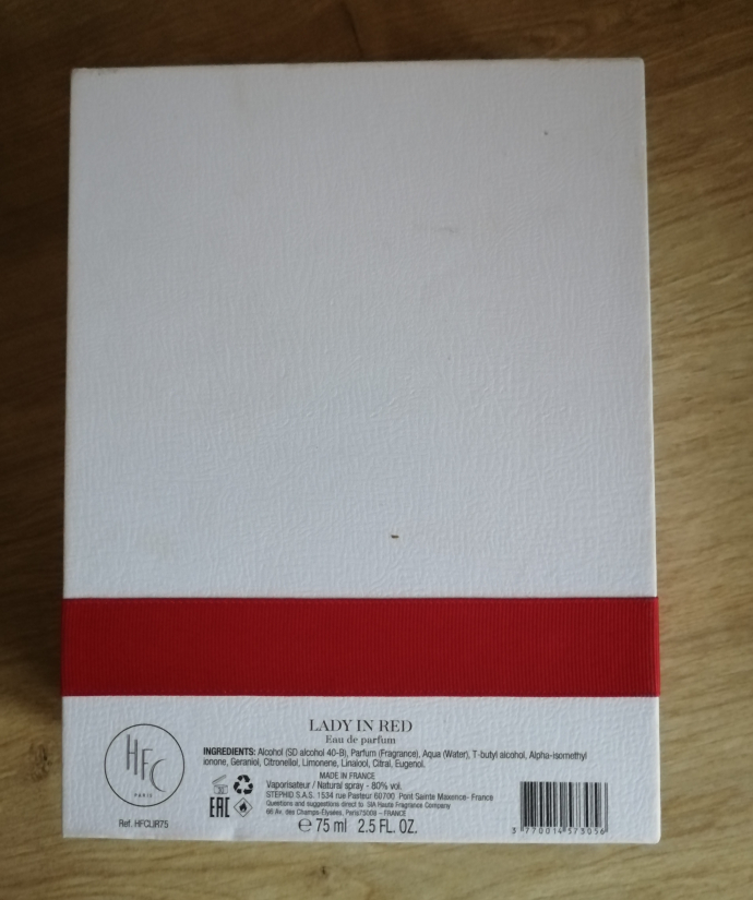 «Lady in Red Haute Fragrance Company HFC — это аромат для женщин, он принадлежит к группе восточные цветочные. Lady in Red выпущен в 2017 году. Парфюмер: Vincent Ricord. Верхние ноты: Розовая вода, Роза и Нероли; средние ноты: Ирис, Розовый перец и Кардамон; базовые ноты: Мускус, Гваяк и Серая амбра.»