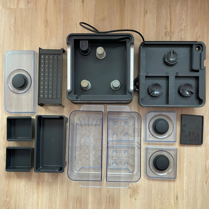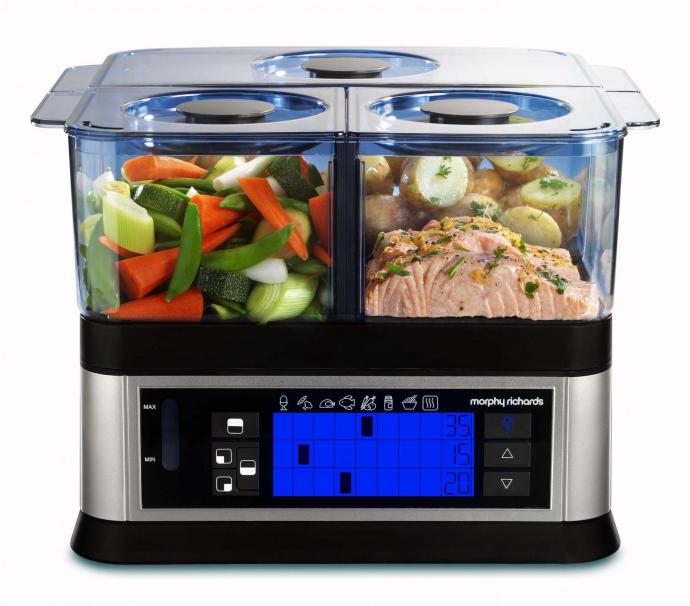 комплекте: пароварка, противень для риса, 2x для соуса, подставка для мяса,