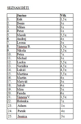 Девочки, вношу коррективы) Игрушек там предостаточно, их как раз просили не везти, тем более, что каждый ребенок получит подарок-игрушку от Деда Мороза. Поэтому носочки, пижамы, нижнее белье, постельное белье и полотенца (новые, по гигиеническим соображениям), спортивные штанишки (tepláky) думаю могут быть и б/у, но в идеальном состоянии. Потом впереди зима! Думаю шапочки теплые, варежки тоже не будут лишними! Всем спасибо за помощь!