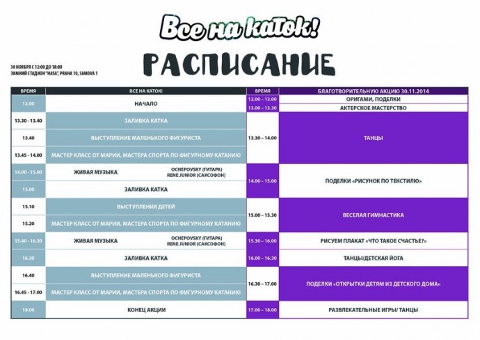 Хочу напомнить, что уже сегодня мы ждем вас на нашем мероприятии «Все на каток»по адресу Samova 1, Praha 10, zimni stadion Hasa, с 12 до 18 часов. Прикрепляю расписание. Первый столбик-программа на льду, второй- программа десткой комнаты.