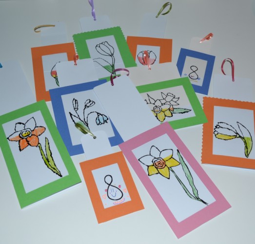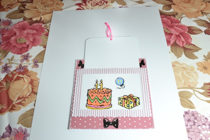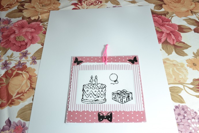Изначально сама открытка (подложка в горошек на нижней открытке), далее рисунок (раскрашенный). А сверху рамочка (она там в полосочку) с плёночкой, на которой лишь контуром нарисован рисунок. Рамочку не приклеивать сверху, чтобы туда сделать вставку из белой бумаги (к-рую потом и достаём за ленточку).