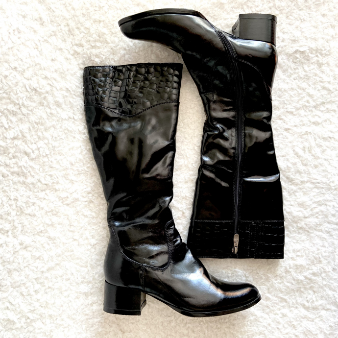 Натуральная лакированная кожа, натуральный мех. Размер 35, но соответствуют размеру 36. 1300 крон. Прага-9.