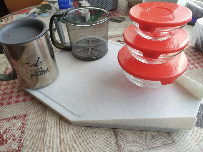 3 ёмкости с крышками 100кр, термокружка 85кр, сито для муки 100кр, доска разделочная 50кр
