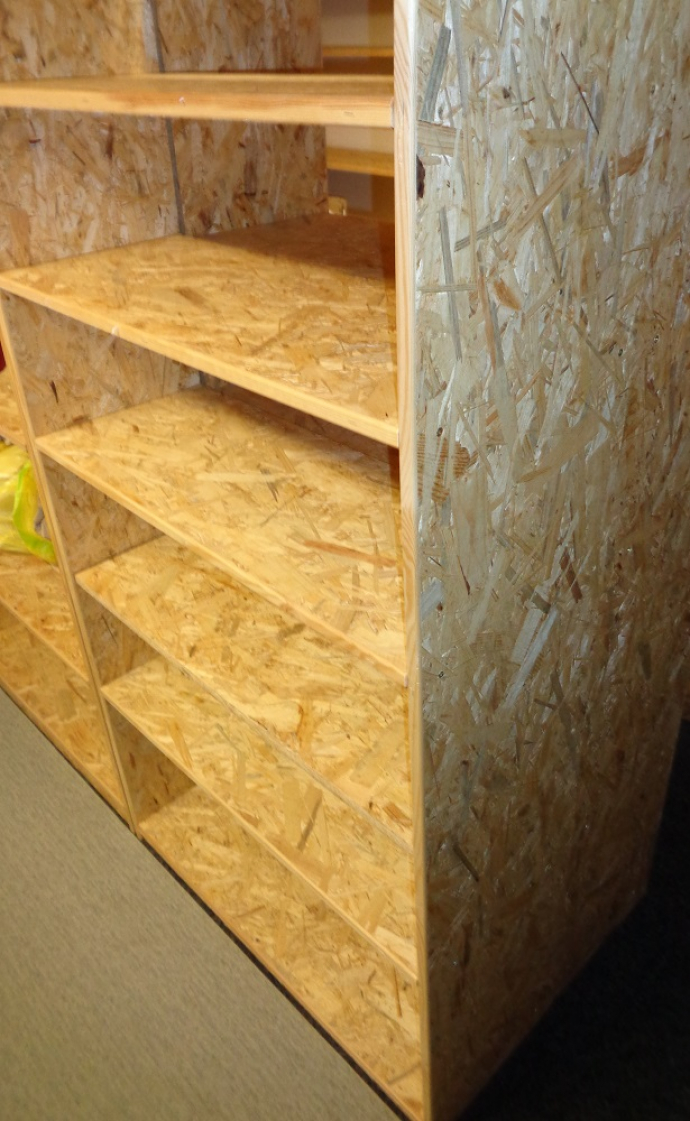 Продам 6 полок, из них 5 одинаковых размером 155 см x 85 см x 31 см, шестая полка уже — 165 см x 50 см x 25 см. Изготовлены из OSB. Цена 1500 крон. Указанная цена относится ко всем 6 полкам.