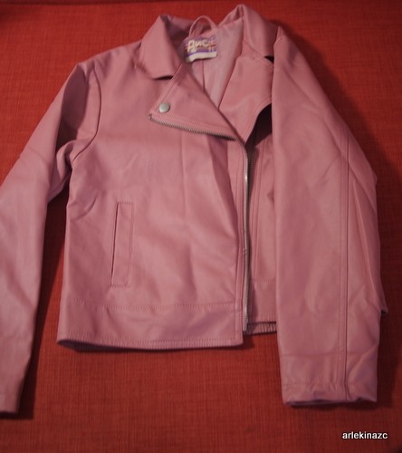 Приятного, не ядовитого розового цвета. Кожзам. Почти не носили. То погоды не было, то выросла. Курточка на весну.