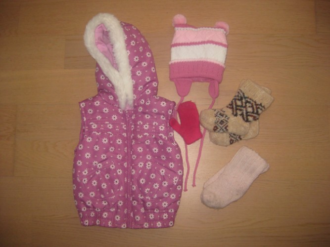 1) Теплый жилет Ф&амп;Ф, на 6-9 месяцев, к нему в придачу рукавицы, 2 пары шерстяных носок, теплая шапочка. 80 крон