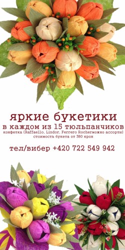 15 тюльпанчиков с конфетками, цветовая гамма на Ваш выбор, заказывать желательно за 3 дня, высылаю фото готового изделия перед доставкой.