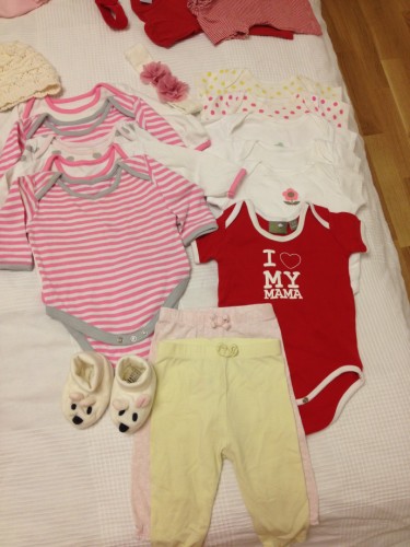 1. Бодики с коротким рукавом mother care на 0-3 мес.- 100 крон (5 штук), красный бодик — 50 крон