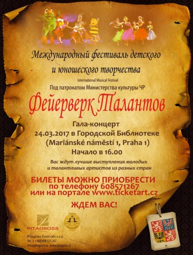 Хотели бы вас пригласить на гала-концерт международного детского и юношеского музыкального фестиваля «ФЕЙЕРВЕРК ТАЛАНТОВ», который состоится сегодня 24 марта 2017 года в 16:00 в центре Праги, в уютном зале Городской Библиотеки Праги (Мариáнскé нáм. 1).
