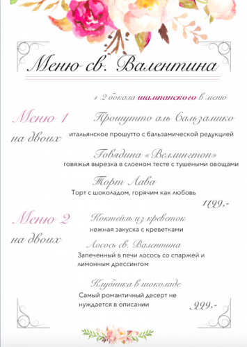 Дорогие мамочки, к нам близится прекрасный и светлый праздник День св. Валентина. Наш ресторан предлагает Вам погрузиться с Вашей второй половинкой в атмосферу тепла и романтики. Ведь праздник для любимых можно сделать когда угодно. Почему же не прямо в самый романтичный день в году?