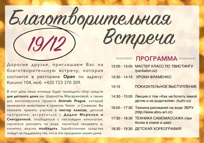 Наша встреча пройдёт в ресторане OPEN, по адресу Korunní 104. начало в 12:00. Цены на мастер классы не установлены — вы можете оставить столько, сколько посчитаете нужным. Так же в этот день ресторан передаст детскому дому определенный процент денег, вырученных за еду и напитки.